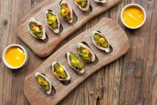 Amba is a spiced pickled mango condiment and has been described by some in the culinary world “as the Middle East equivalent of umami.” Iraqi immigrants brought it to Israel, although it is thought to have originated in India. In the Indian language Marathi, amba means mango. Iraqi Jews frequently used amba in sabich, a fried eggplant and egg sandwich, but its popularity arose with their opening shawarma and falafel restaurants in Israel. The piquant tropical mango condiment balances perfectly with falafel and meats and other proteins and is popping up in creative ways in faraway cities in the States and London.